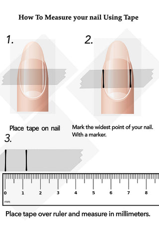 Soft tape measuring: Place tape around the widest part of your nail making sure to push it into the creases on the side of your nail, making sure it is flush with your nail bed as well.. Mark both of your side walls on the tape (right where your nail meets your skin). Remove the tape and lay in on a flat surface to measure it up against a ruler. Make sure you line your one side wall on the 0 of your ruler, and make sure you measure in millimeters. If you are in-between lines measure to the next size up!